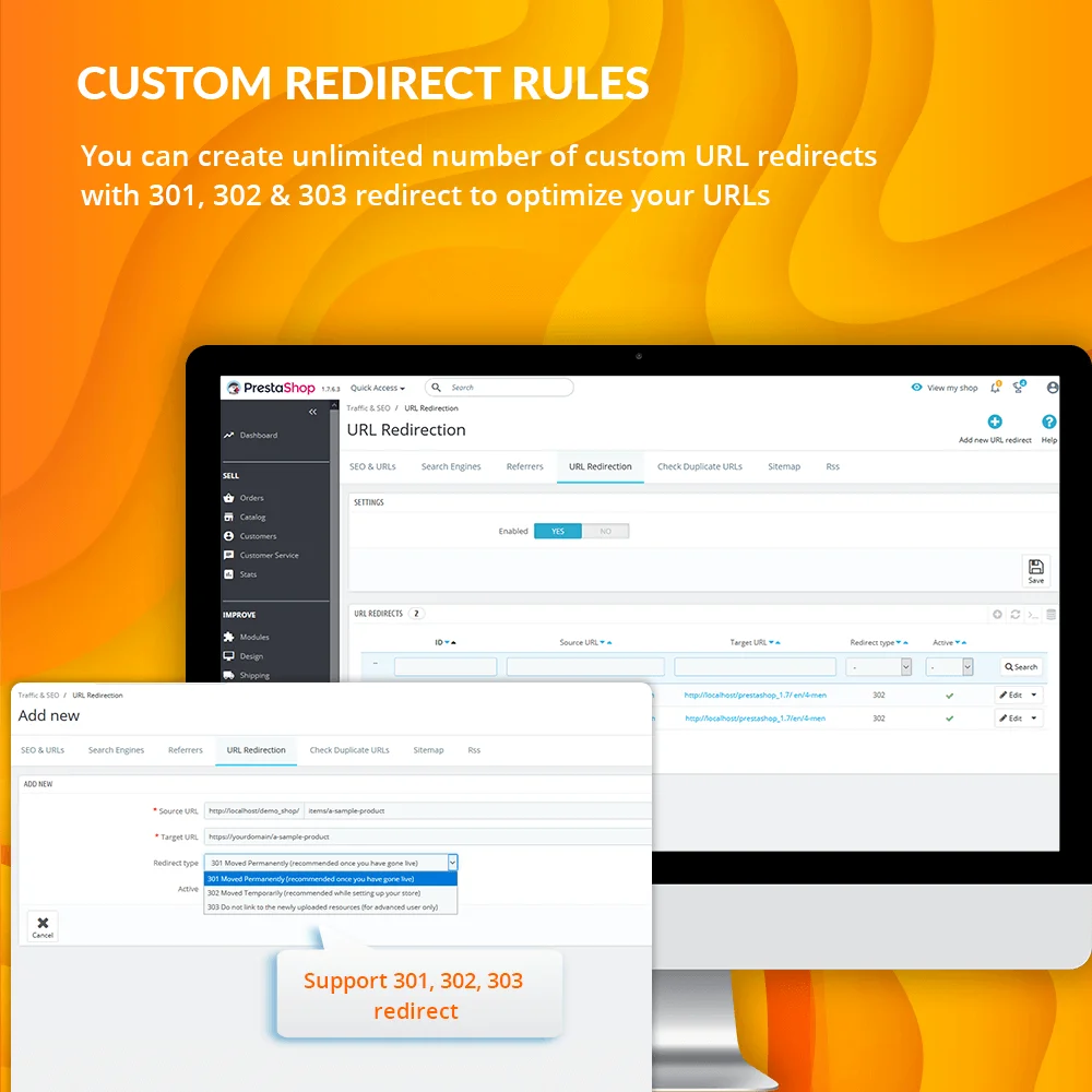 Take control of your website's structure with custom URL redirections. Our module offers seamless 301, 302, and 303 redirection options, allowing you to effortlessly maintain your SEO rankings and preserve valuable backlinks during content migrations or structural changes.