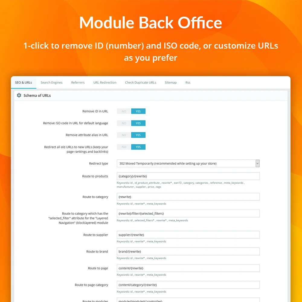In addition, this module also offers auto – redirect feature that automatically redirects all old URLs (with ID and ISO code) to new URLs (without ID and ISO code) to maintain your SEO rankings and backlinks.