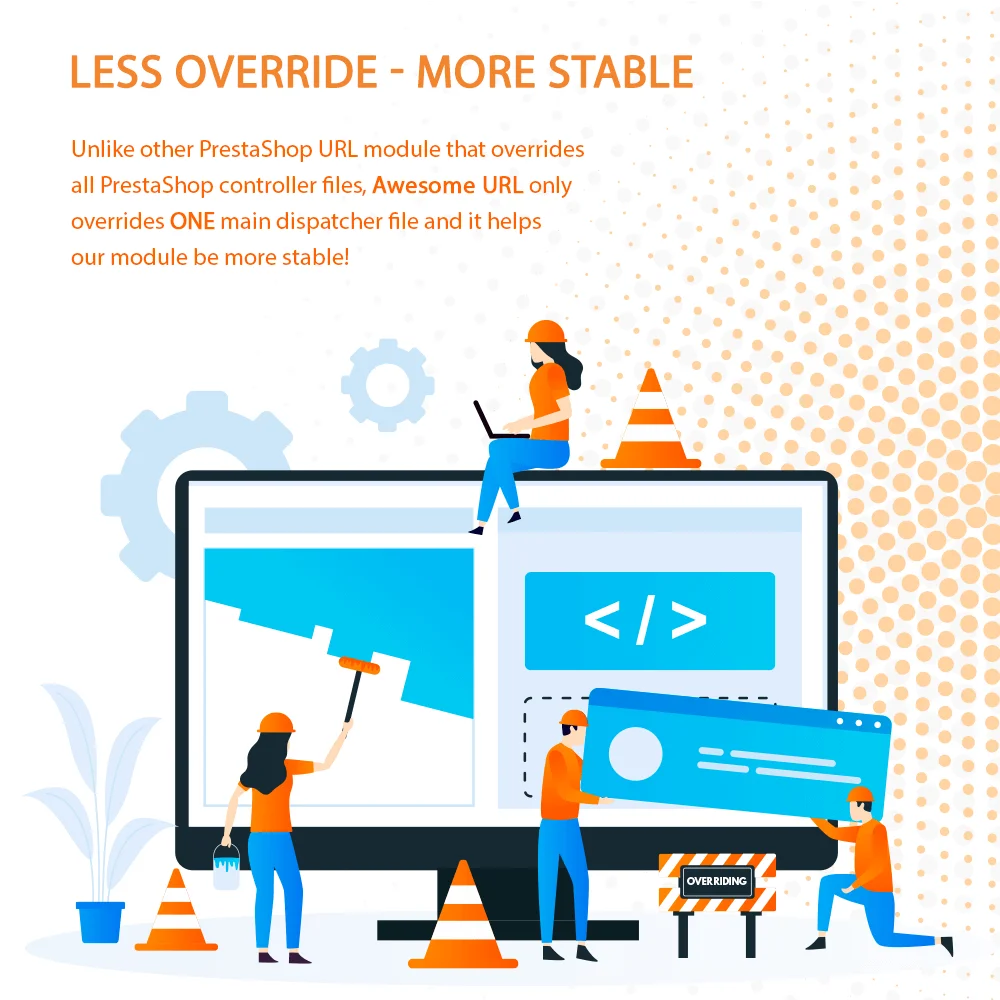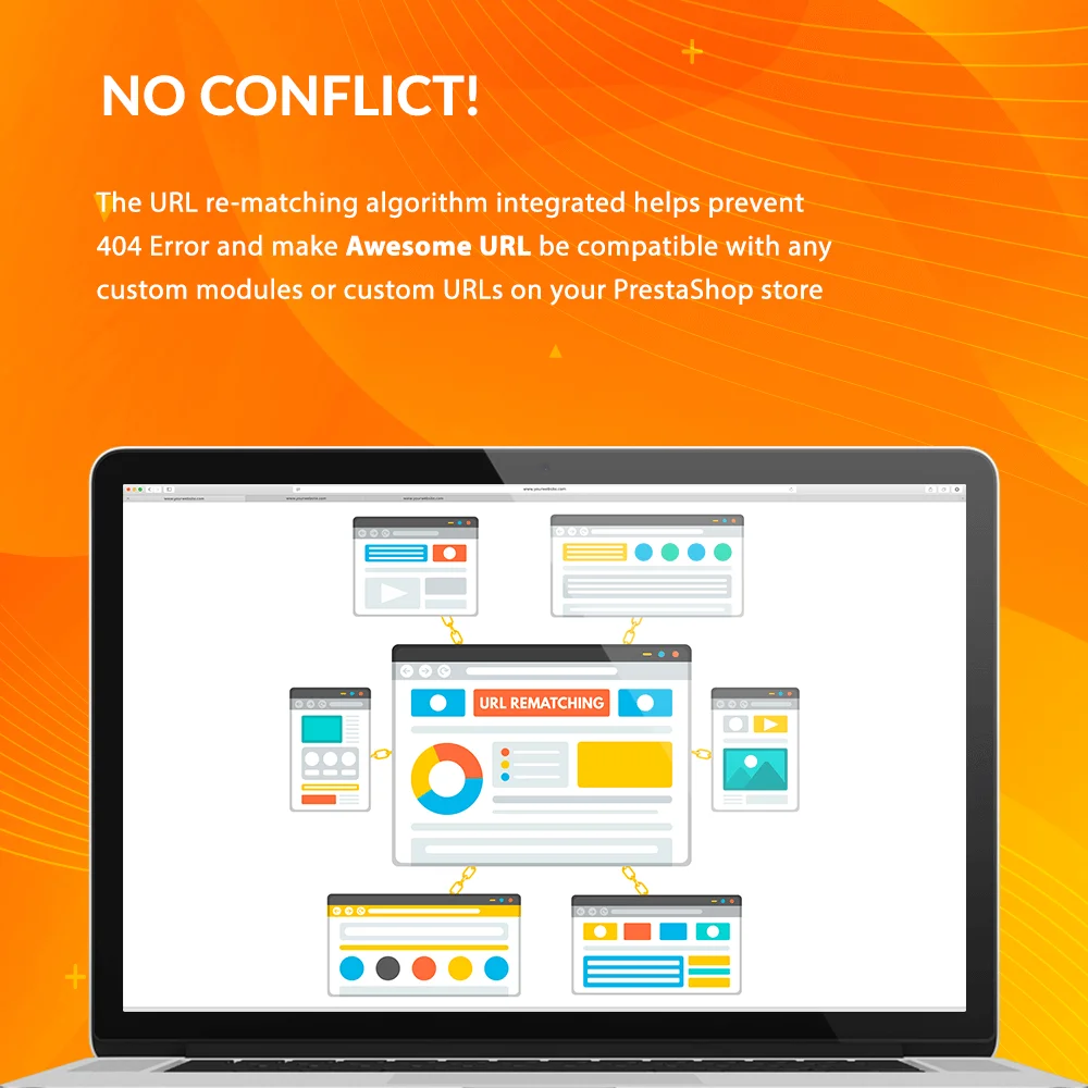 Worried about compatibility issues with custom modules or URLs on your PrestaShop store? Fear not! Awesome URL integrates seamlessly with URL re-matching algorithms and minimizes overrides, ensuring stability and compatibility with your store's existing components.