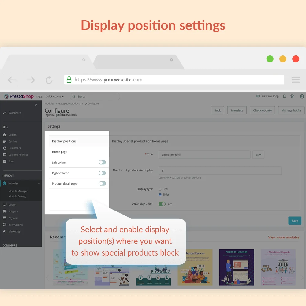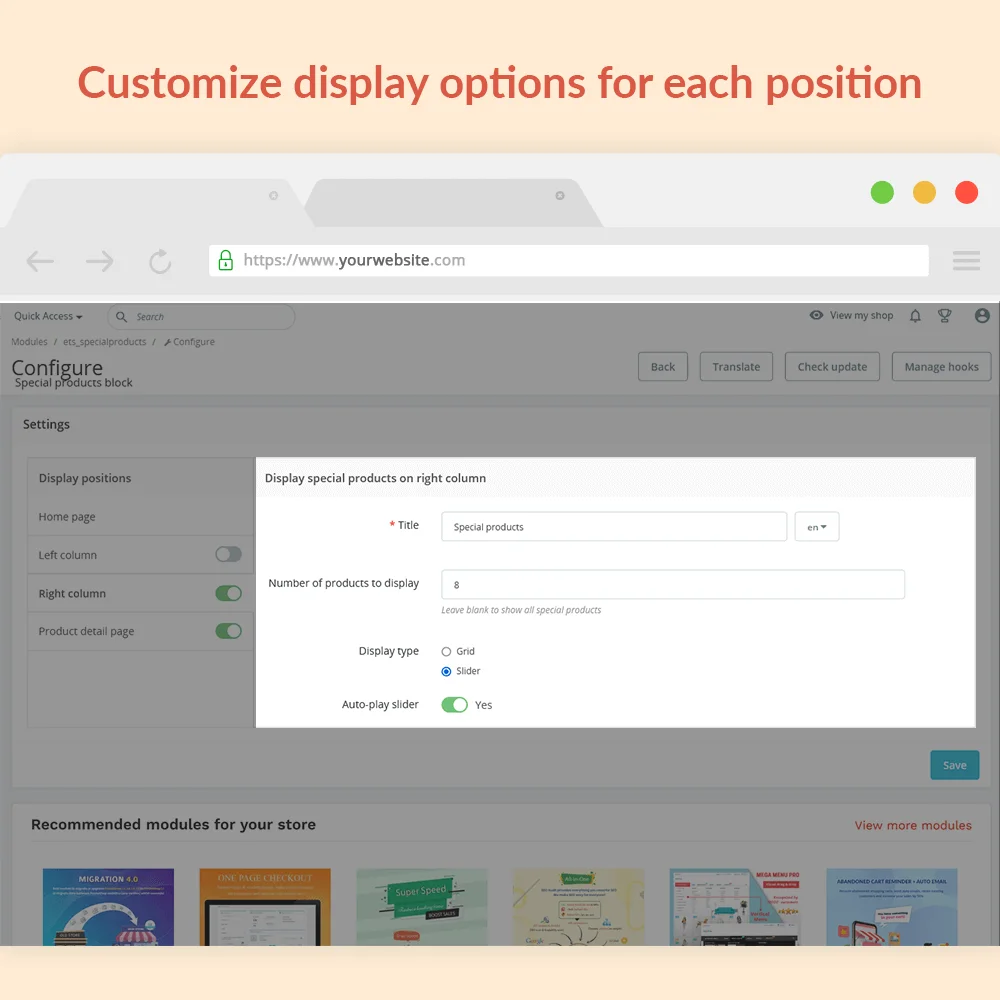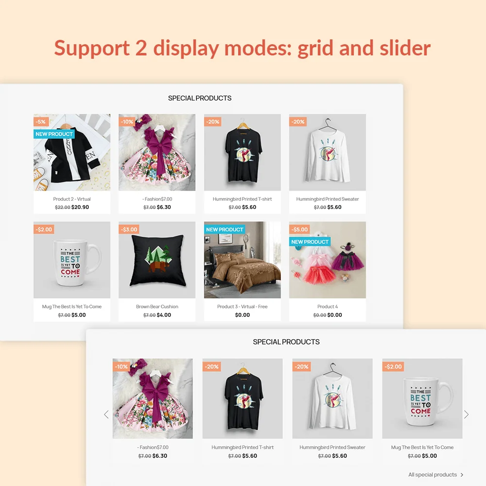Although PrestaShop does offer a built-in module to display special products, it comes with several limitations. The most notable restriction is its limited flexibility in display positions. The default module might not allow you to place your special product blocks exactly where you want them on your website, which can hinder the effectiveness of your promotional strategies. Recognizing these shortcomings, we have developed a module with enhanced features to address these limitations and better cater to the actual needs of users.