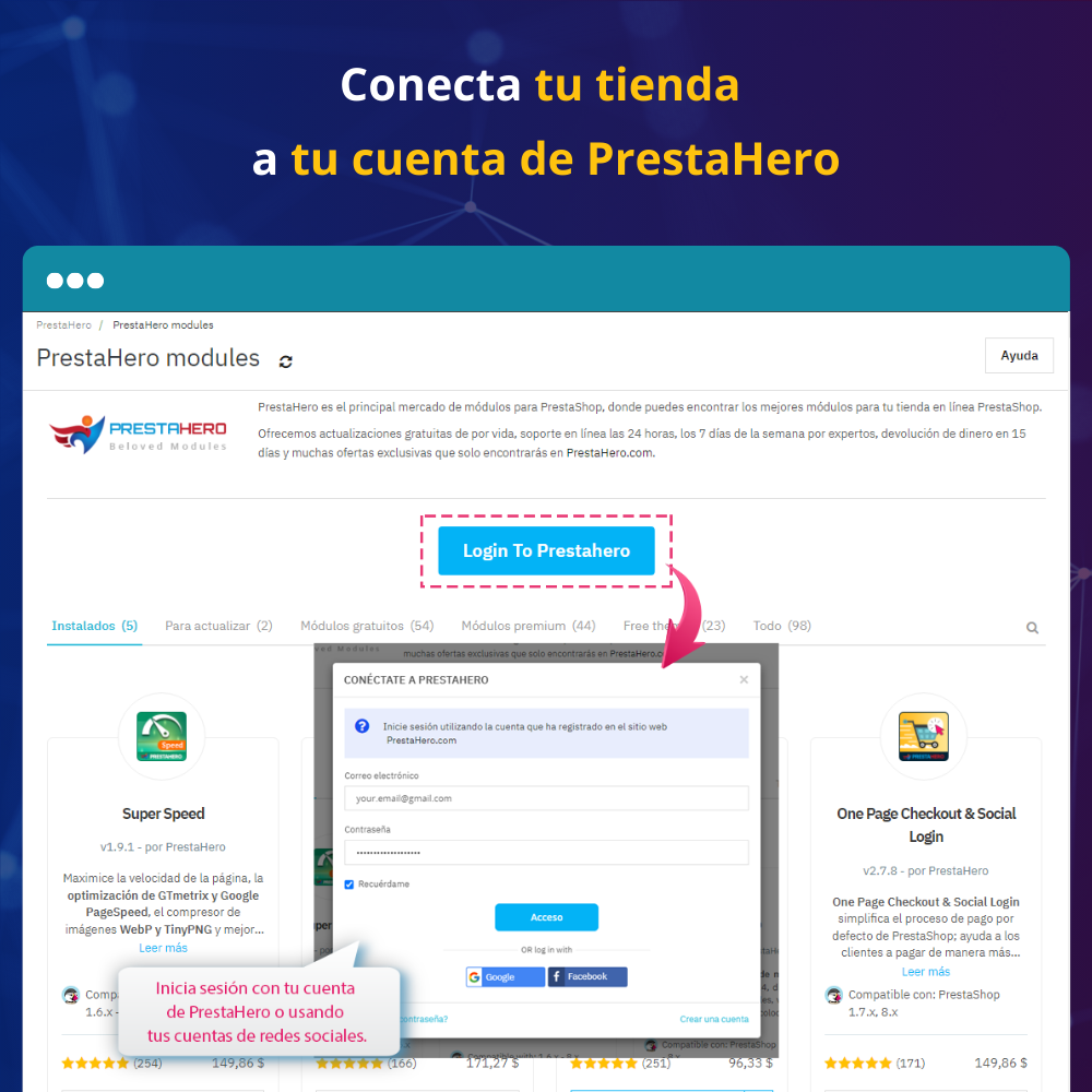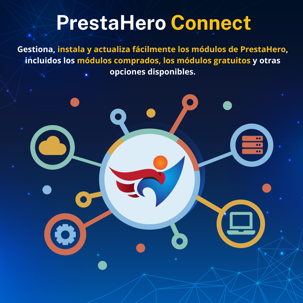 PrestaHero es una plataforma de prestigio que ofrece una amplia gama de módulos esenciales para tu tienda en línea PrestaShop. Gracias al módulo gratuito "PrestaHero Connect", que facilita la conexión de tu tienda a PrestaHero, puedes gestionar directamente, instalar y actualizar todos los módulos desde el back office de tu tienda (incluidos los módulos comprados, gratuitos y otros disponibles en PrestaHero). Accede y controla cómodamente tus módulos iniciando sesión en PrestaHero Connect con tu cuenta registrada en el sitio web de PrestaHero.