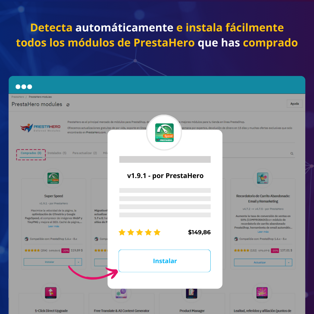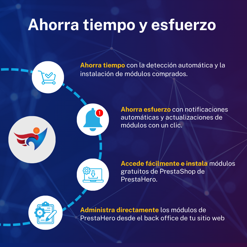 La gestión de módulos de PrestaShop nunca ha sido tan sencilla. Con PrestaHero Connect, puedes detectar e instalar automáticamente todos los módulos comprados en PrestaHero directamente desde el panel de control de tu sitio web. Olvídate del tedioso proceso de instalación manual. PrestaHero Connect se encarga de todo, ahorrándote tiempo y esfuerzo valiosos.