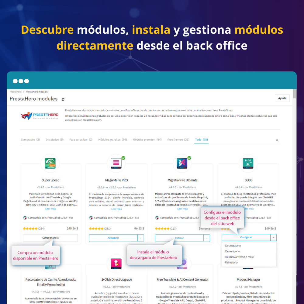 +3 MoreGestiona, instala y actualiza fácilmente todos los módulos de PrestaShop desde PrestaHero, incluidos los módulos adquiridos, los módulos gratuitos y descubra otros módulos disponibles ofrecidos por PrestaHero.