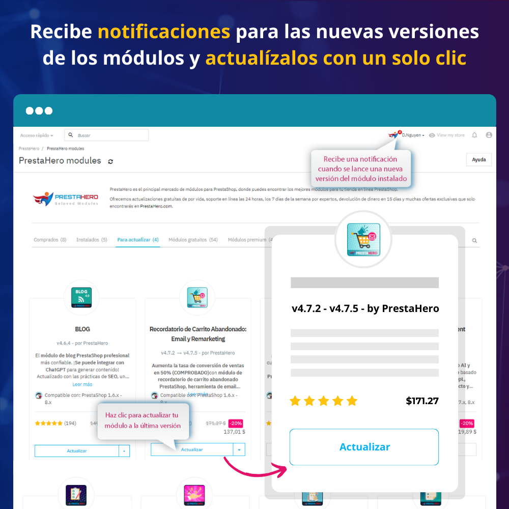 Con PrestaHero Connect, actualizar tus módulos a versiones más recientes nunca ha sido más sencillo. Un solo clic es todo lo que necesitas para asegurarte de que tu tienda en línea se beneficie de los avances y mejoras más recientes.