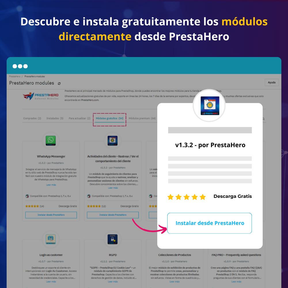Además de gestionar y actualizar tus módulos de PrestaHero comprados, PrestaHero Connect también te permite descargar e instalar módulos de PrestaShop gratuitos desde PrestaHero. Amplía las capacidades de tu tienda con una variedad de ofertas, todas accesibles a través de esta interfaz fácil de usar.