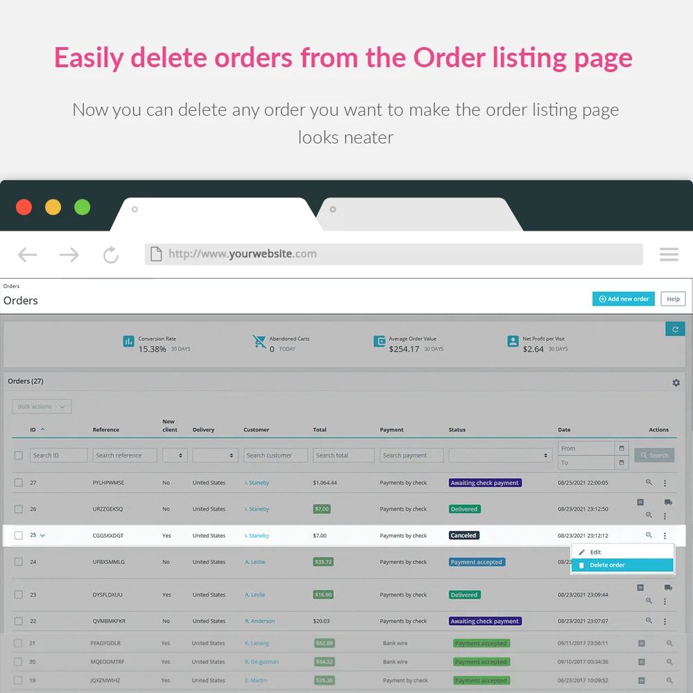 Entonces, ¿cómo puedes eliminar un pedido en PrestaShop 1.7? Con Delete Order, un módulo gratuito de eliminación de pedidos para PrestaShop, puedes eliminar los pedidos innecesarios que desees para que la página de listado de pedidos se vea más ordenada y también sea más fácil de gestionar para ti.
