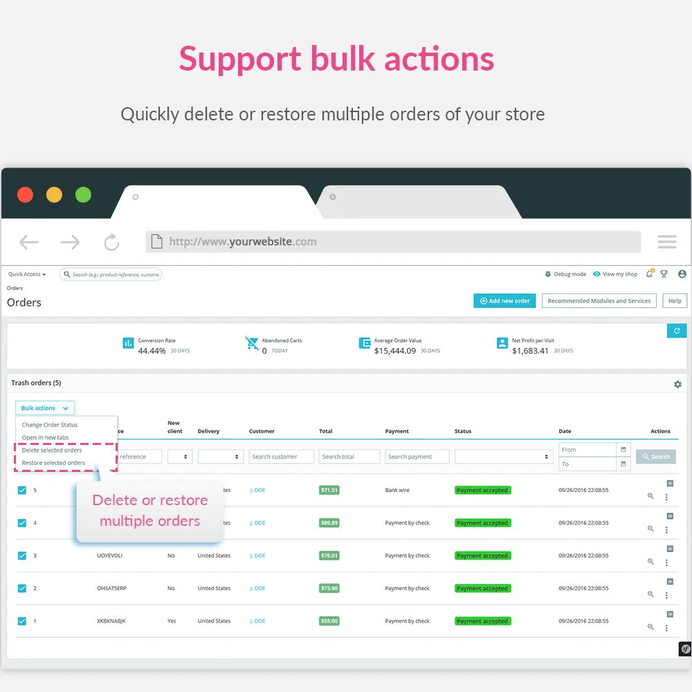 Delete Order es un módulo gratuito de eliminación de pedidos para PrestaShop que te permite eliminar pedidos de la página de listado de pedidos y moverlos a la "Papelera de pedidos". Desde allí, puedes decidir eliminar definitivamente o restaurar ese pedido si es necesario.