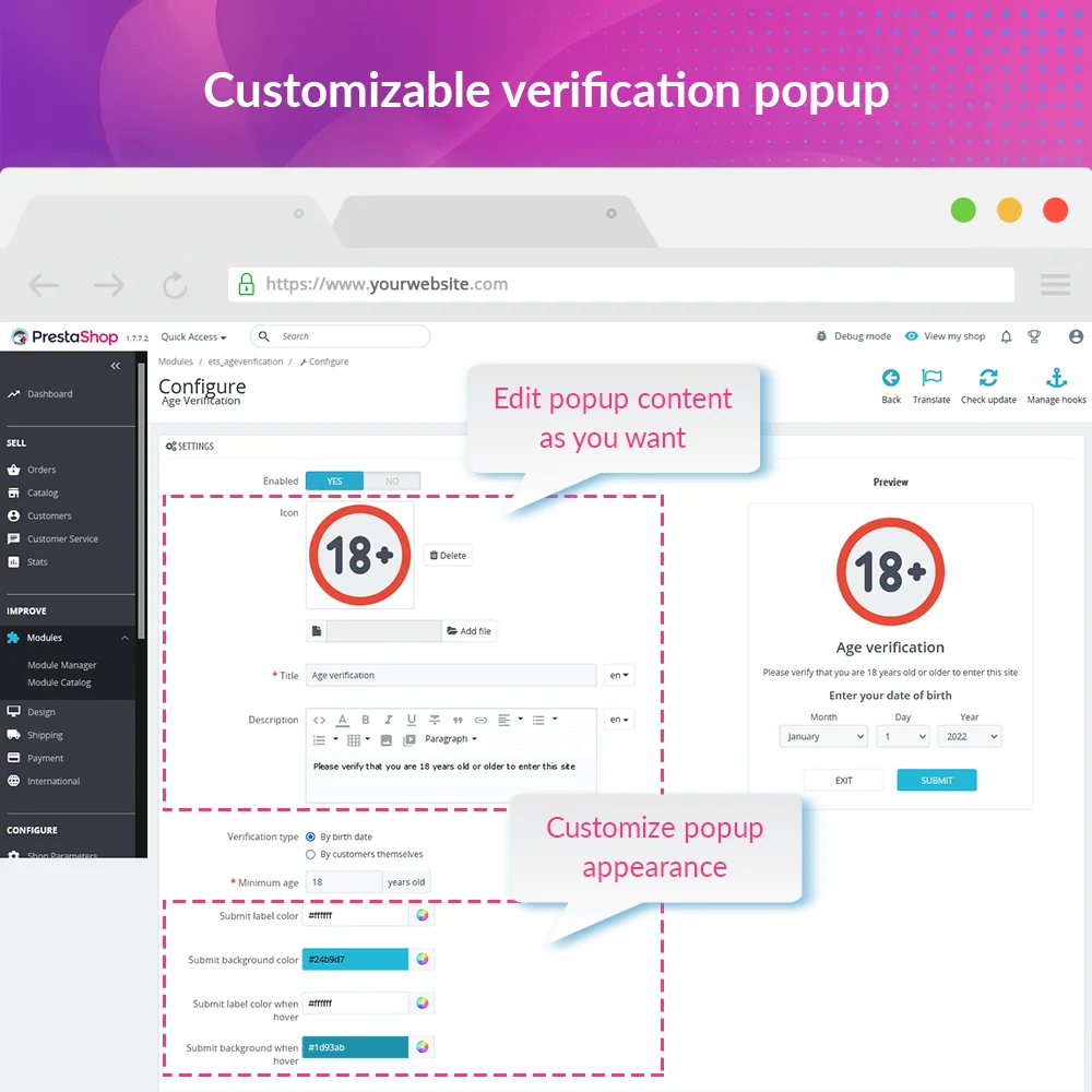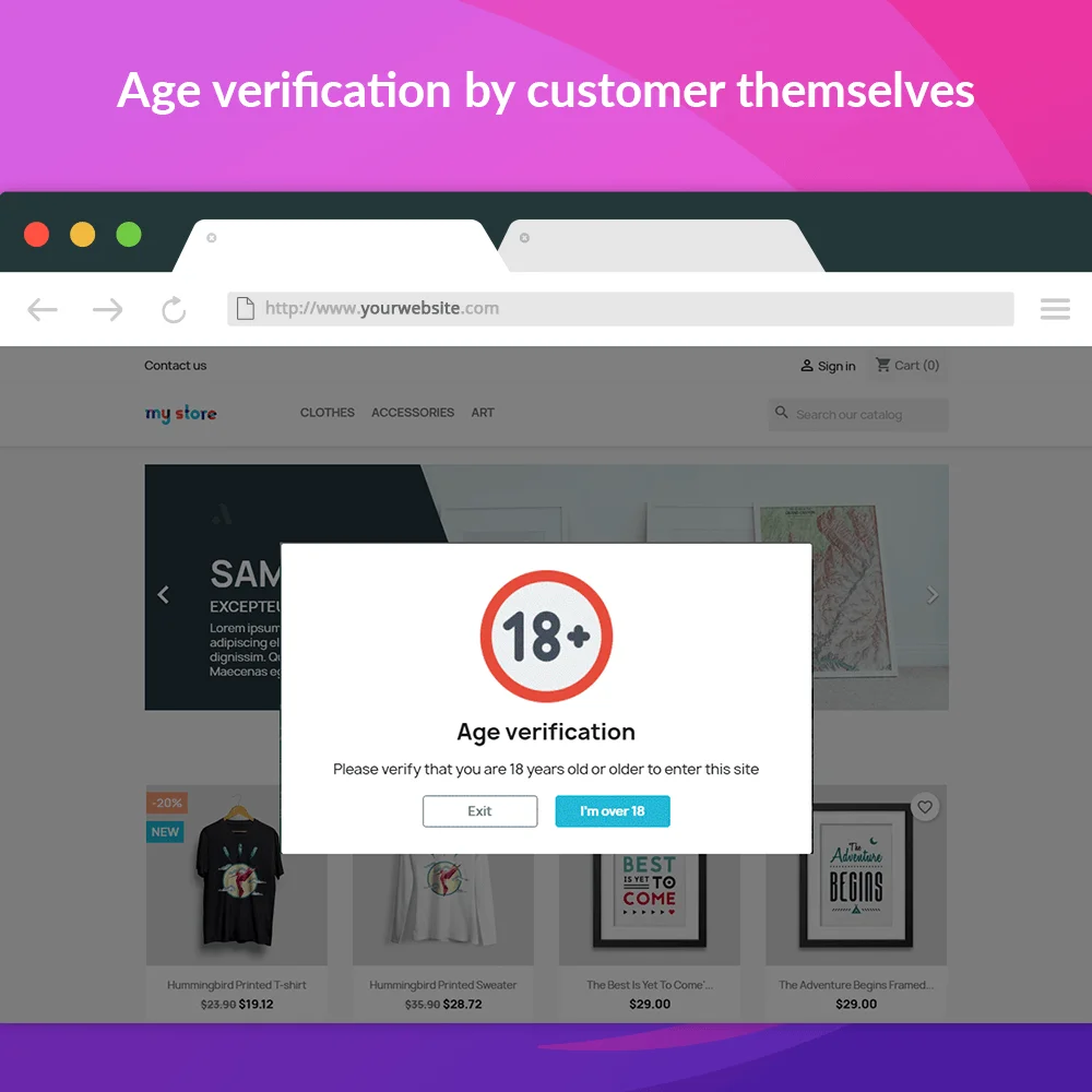 Age Verification: nuestro módulo de Age Verification de PrestaShop puede ayudarlo a integrar este widget en el sitio web de su tienda. Te ayuda a verificar la edad de tus visitantes. ¡Y no te preocupes, es completamente GRATIS!