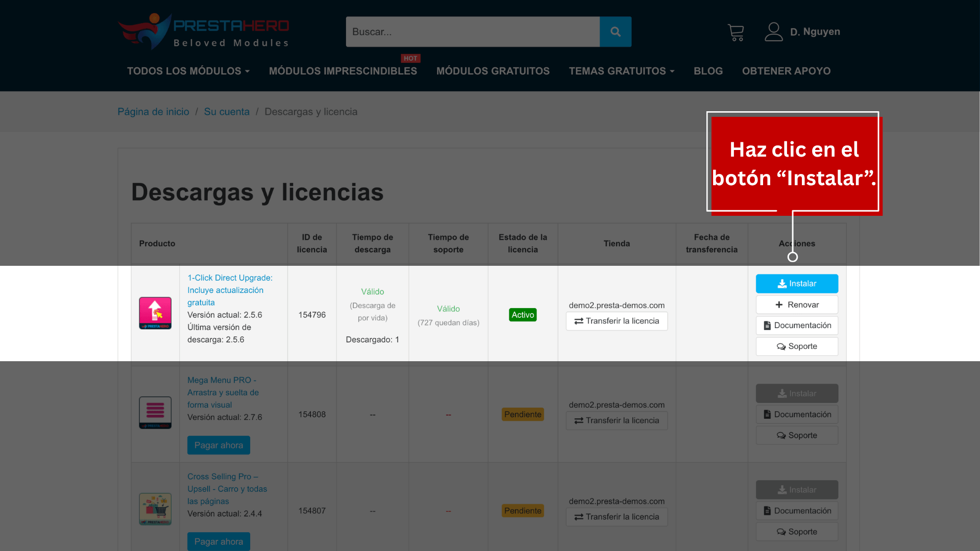 • Verás la lista de módulos comprados. Encuentra el que deseas instalar y haz clic en el botón “Instalar