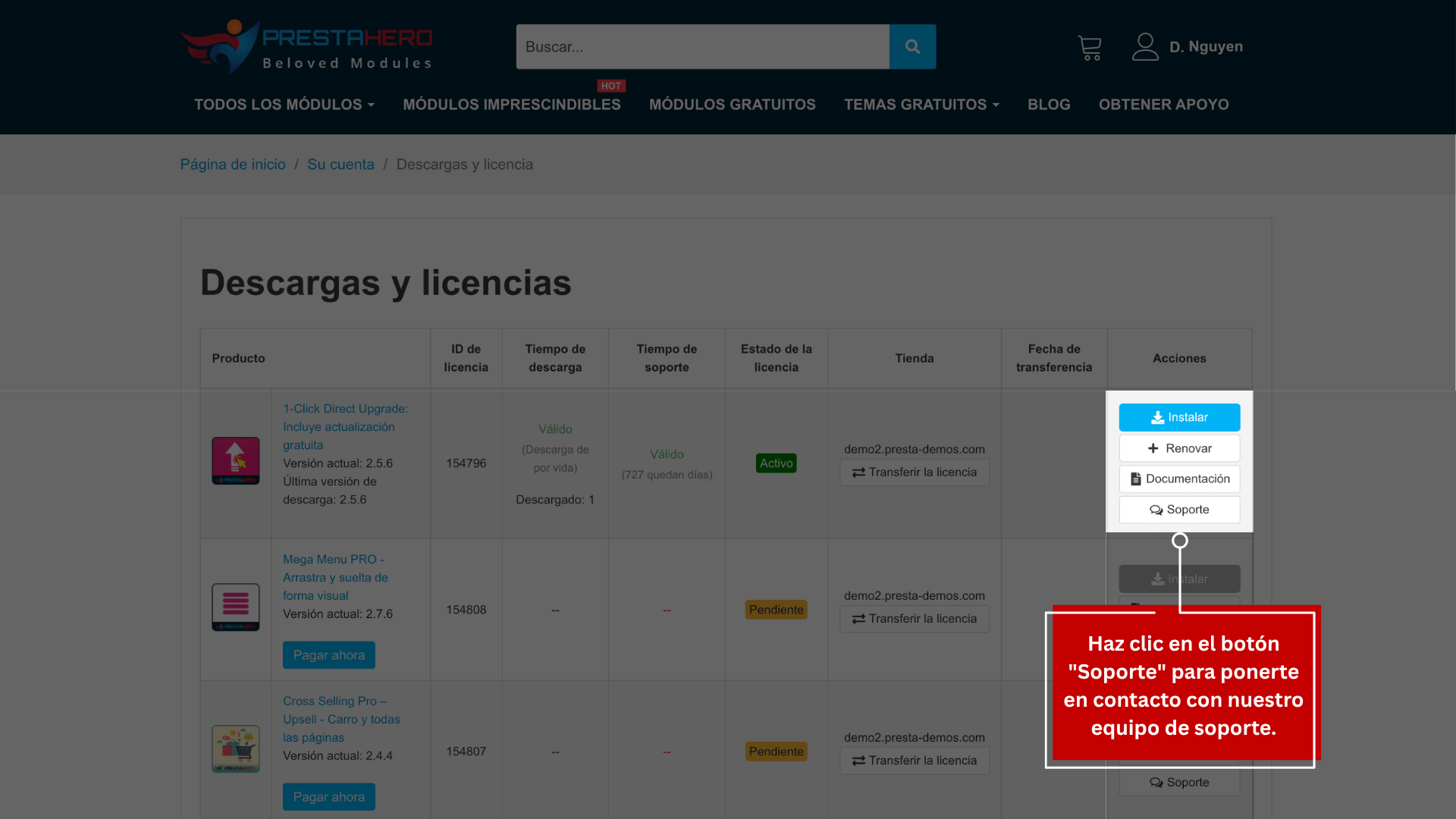 Si necesitas ayuda para instalar o usar un módulo, haz clic en el botón “Soporte” junto al módulo para contactar con nuestro equipo. ¡Estaremos encantados de ayudarte!