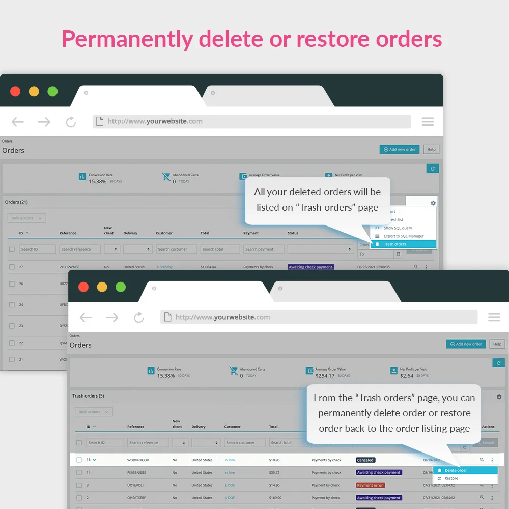 Delete Order est un module gratuit de suppression de commandes de PrestaShop qui vous permet de supprimer des commandes de la page de liste des commandes et de les déplacer vers la "Commandes de corbeille". À partir de là, vous pouvez décider de supprimer ou de restaurer définitivement cette commande si nécessaire.