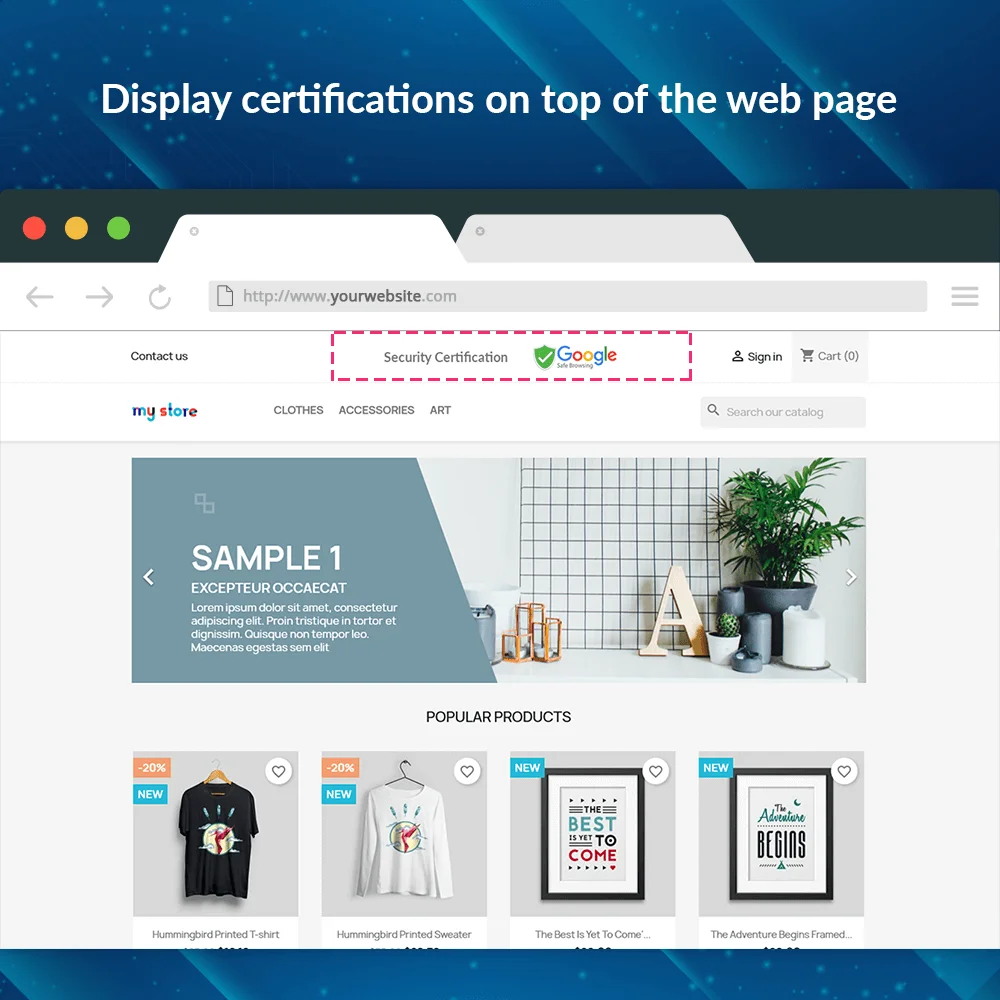 +3 MorePubliez des images de certificat de sécurité sur le site web. Faites savoir aux visiteurs que votre site est sûr et fiable avec notre module de certification de sécurité PrestaShop.