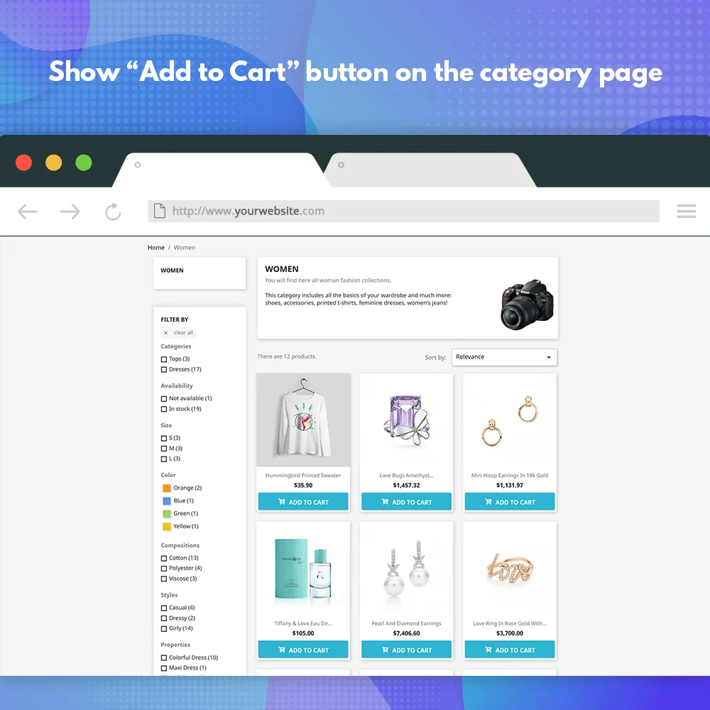 Par défaut, PrestaShop ne permet pas aux utilisateurs d'afficher le bouton "Add to Cart" sur les pages de liste. Cependant, avec notre module gratuit de personnalisation PrestaShop pour ajouter un bouton au panier - "Add To Cart From List", vous pouvez facilement inclure un bouton "Add to Cart" sur les pages de liste de produits telles que la page d'accueil, la catégorie de produits ou les pages de résultats de recherche. Cette fonctionnalité supplémentaire aide les clients à gagner du temps et à avoir une expérience d'achat agréable.