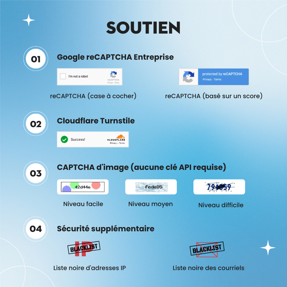 L’utilisation des types de captcha par défaut est déjà une excellente manière de protéger votre site contre le spam. Cependant, si vous estimez que ce n’est pas suffisamment sécurisé, vous pouvez activer Google reCAPTCHA – une solution captcha bien connue fournie par Google. CAPTCHA - reCAPTCHA prend désormais en charge à la fois Google reCAPTCHA Legacy (reCAPTCHA v2 et reCAPTCHA v3) et les dernières versions de reCAPTCHA Enterprise (Enterprise – checkbox et Enterprise – score-based), offrant une protection plus forte et plus précise pour tous les formulaires de votre site.
