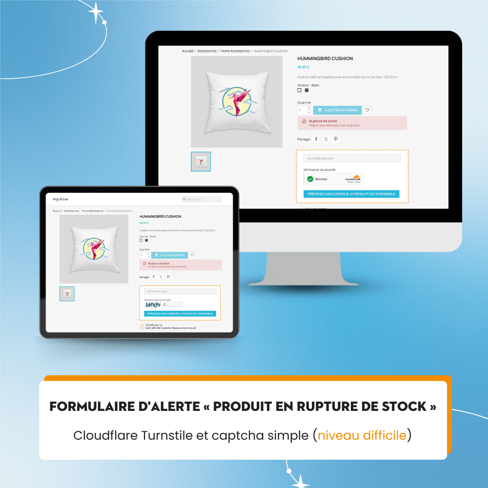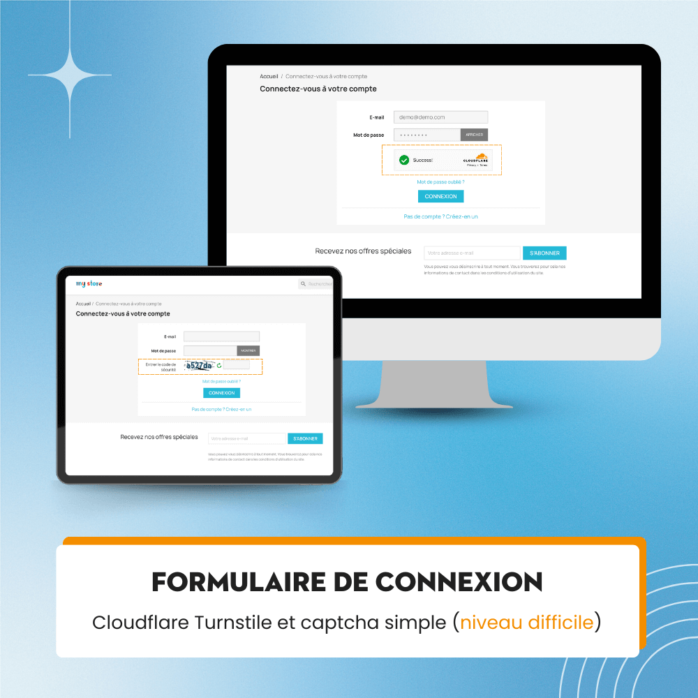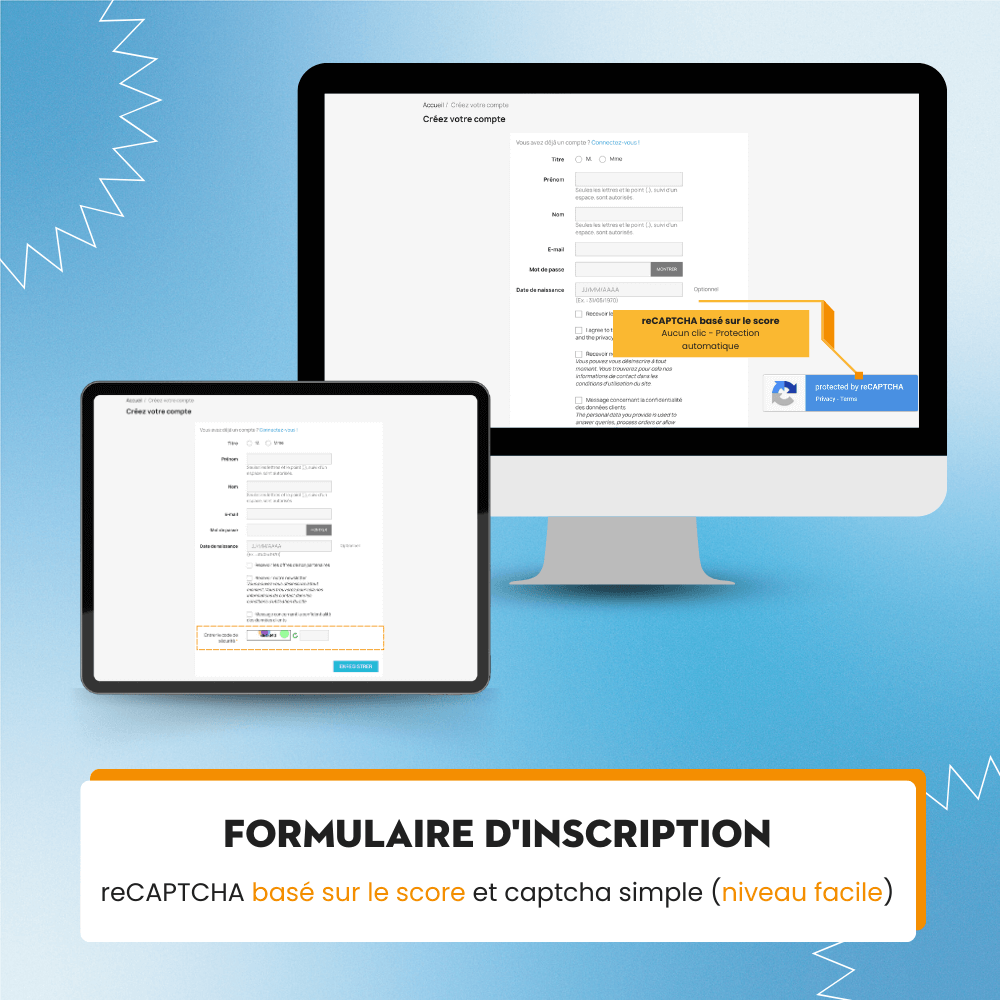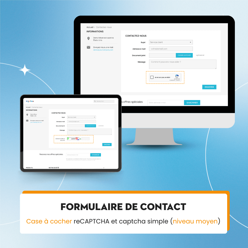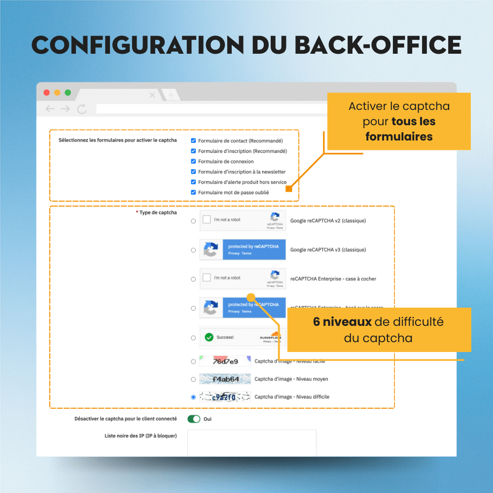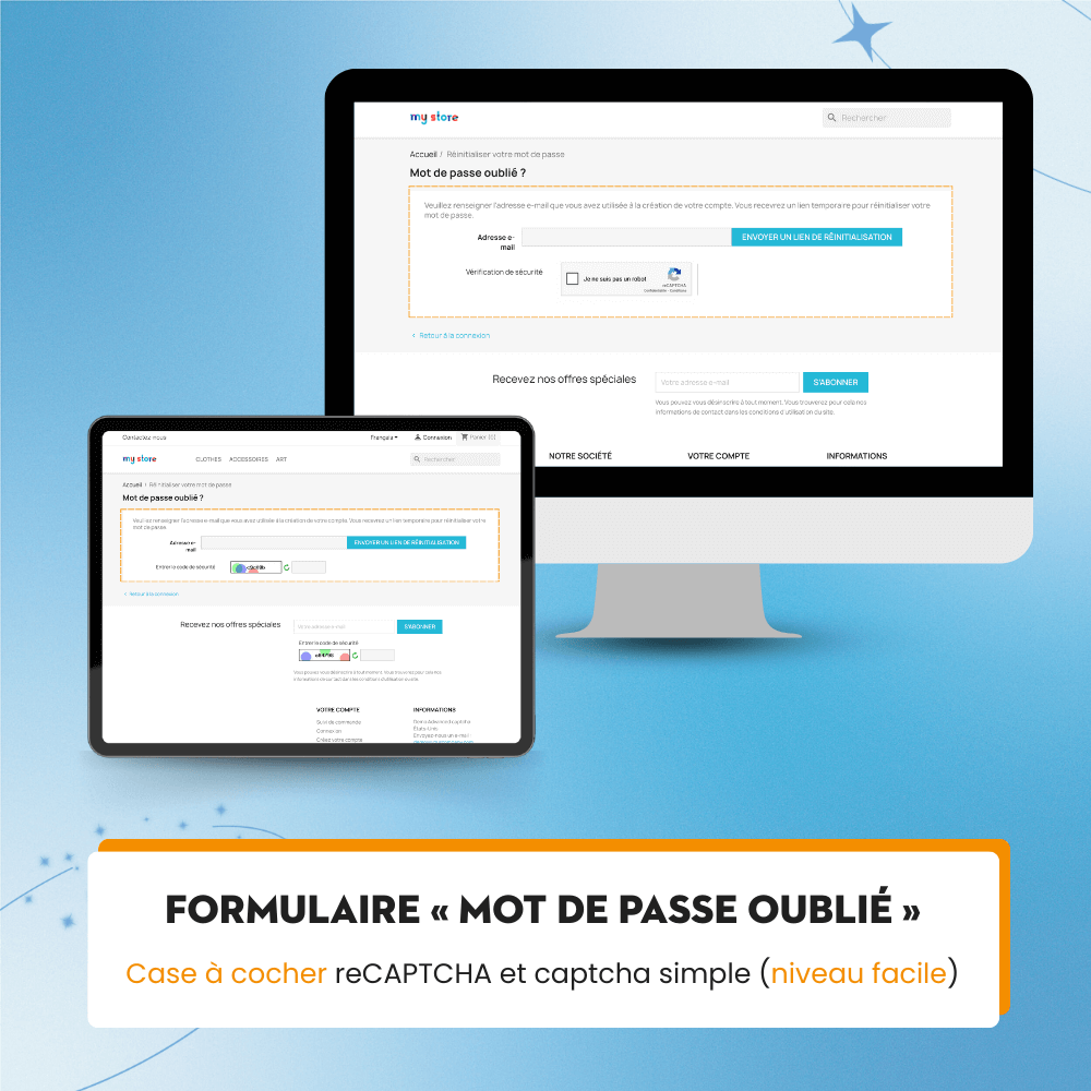 Ce module de captcha pour PrestaShop peut être activé à différents endroits tels que le formulaire d'inscription d'utilisateur, le formulaire de contact, le formulaire de connexion, le formulaire d'inscription à la newsletter, le formulaire de mot de passe oublié et le formulaire d'alerte de produit épuisé de votre site web, offrant une solution complète pour protéger votre site web contre le spam. Soyez assuré que toutes les données de vos clients sont RÉELLES, pas du spam !