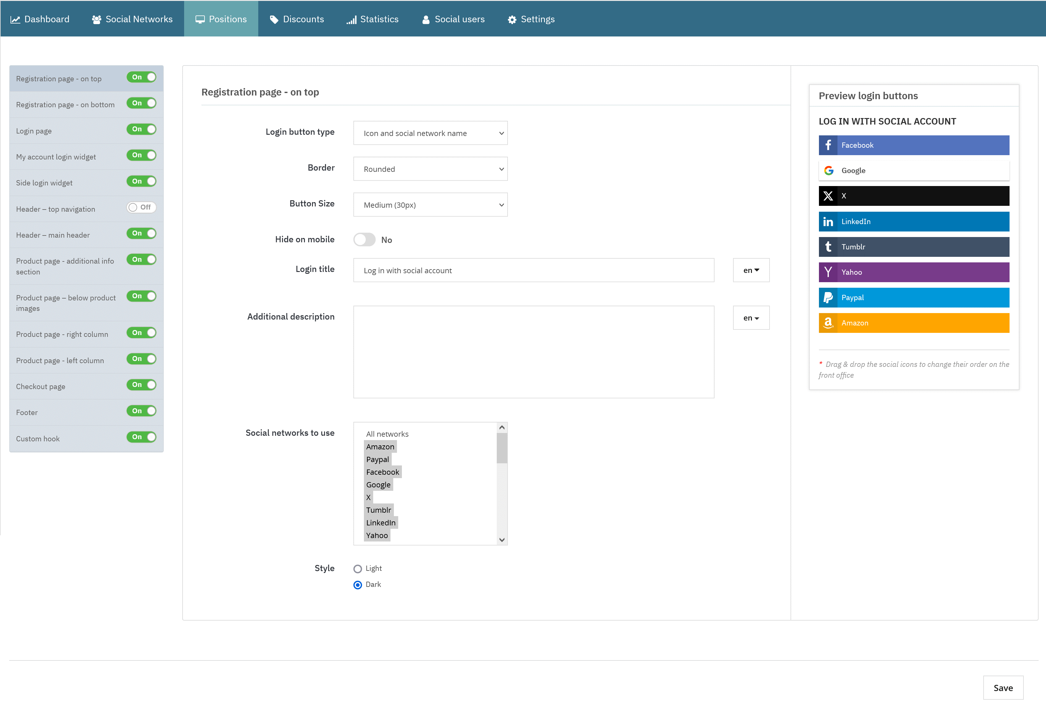 Select the “Positions” menu to access the available display options for social login buttons.