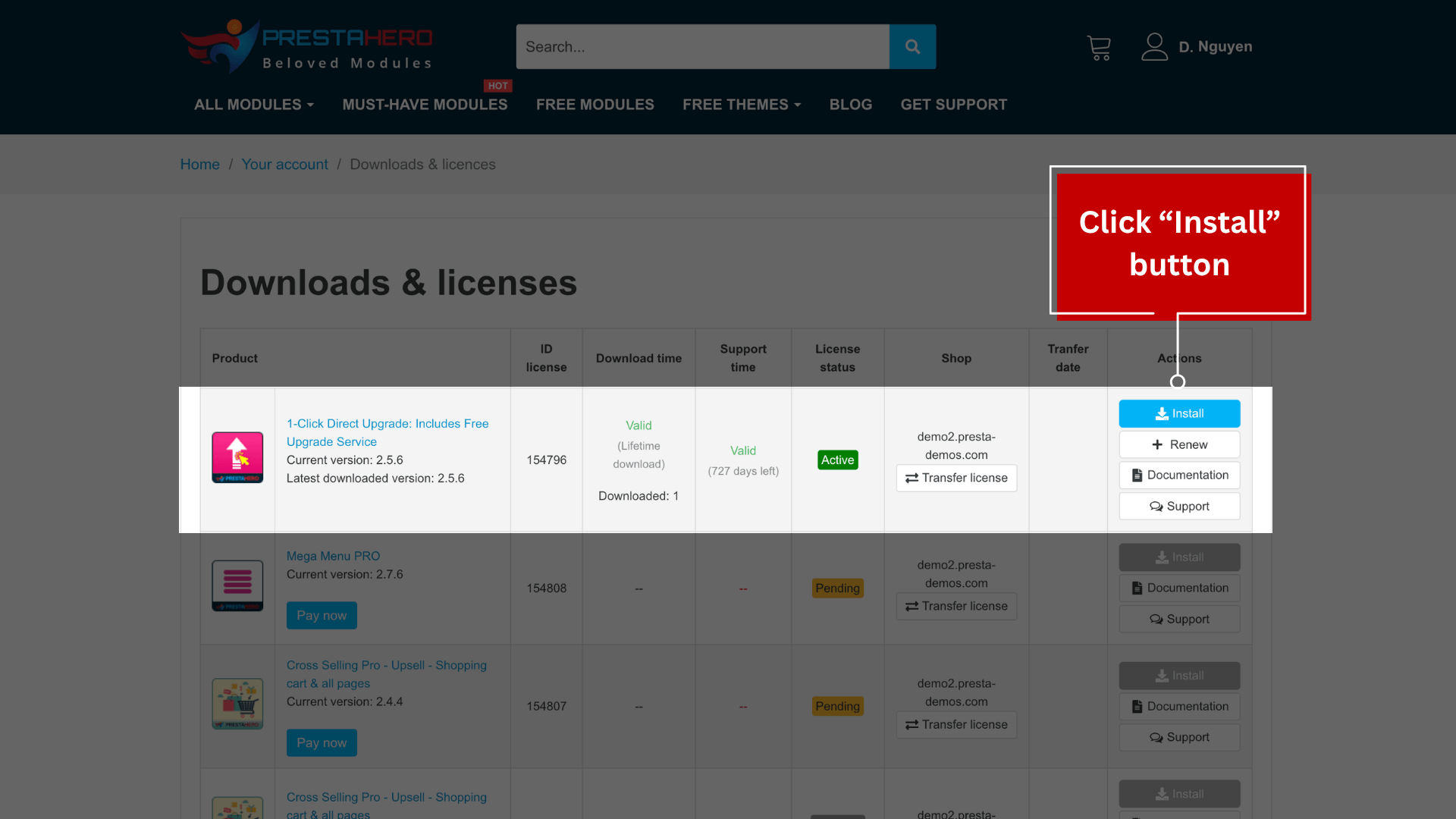 • You will see a list of the modules you have purchased. Find the module you want to install and click the “Install” button (as shown in the screenshot below).