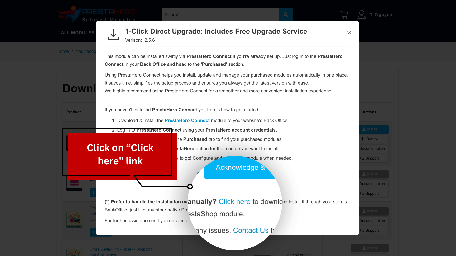 Just install our free PrestaHero Connect module in your back office, log in with your PrestaHero account, then go to the “Purchased” tab, find the module you’ve purchased, and click “Install from PrestaHero” to start the installation.
