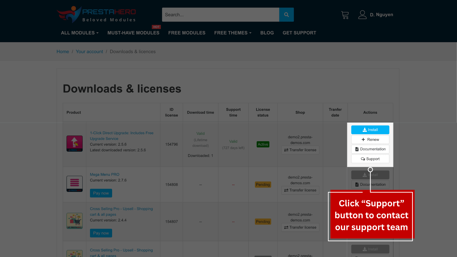 If you need any assistance with installing or using a specific module, click the “Support” button next to the module to reach out to our support team. We’re always happy to assist you!