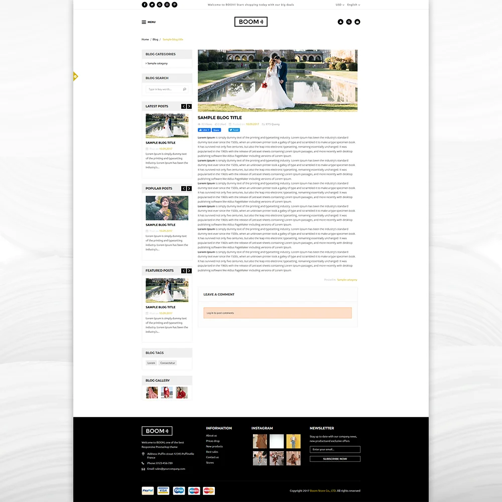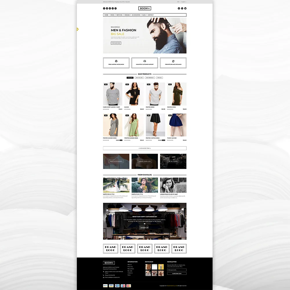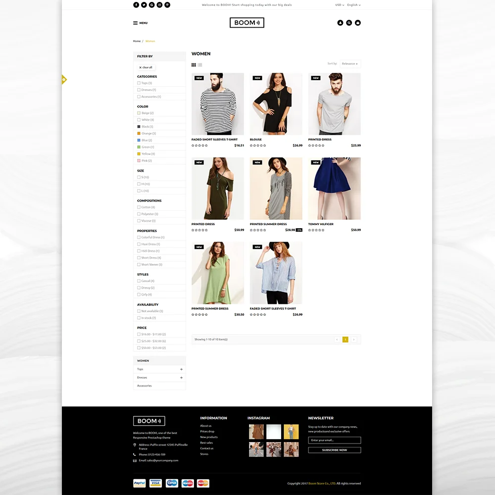 Boom è perfettamente adatto per i negozi di moda e accessori, è completamente reattivo e facile da installare oltre che da personalizzare con un potente pannello di editor del tema. Questo tema è stato sviluppato e testato attentamente secondo gli standard dei siti web popolari oggi (convalida w3c, tutti i moduli PrestaShop personalizzati sono convalidati, compatibilità con i browser, implementazione HTML/CSS3...)
