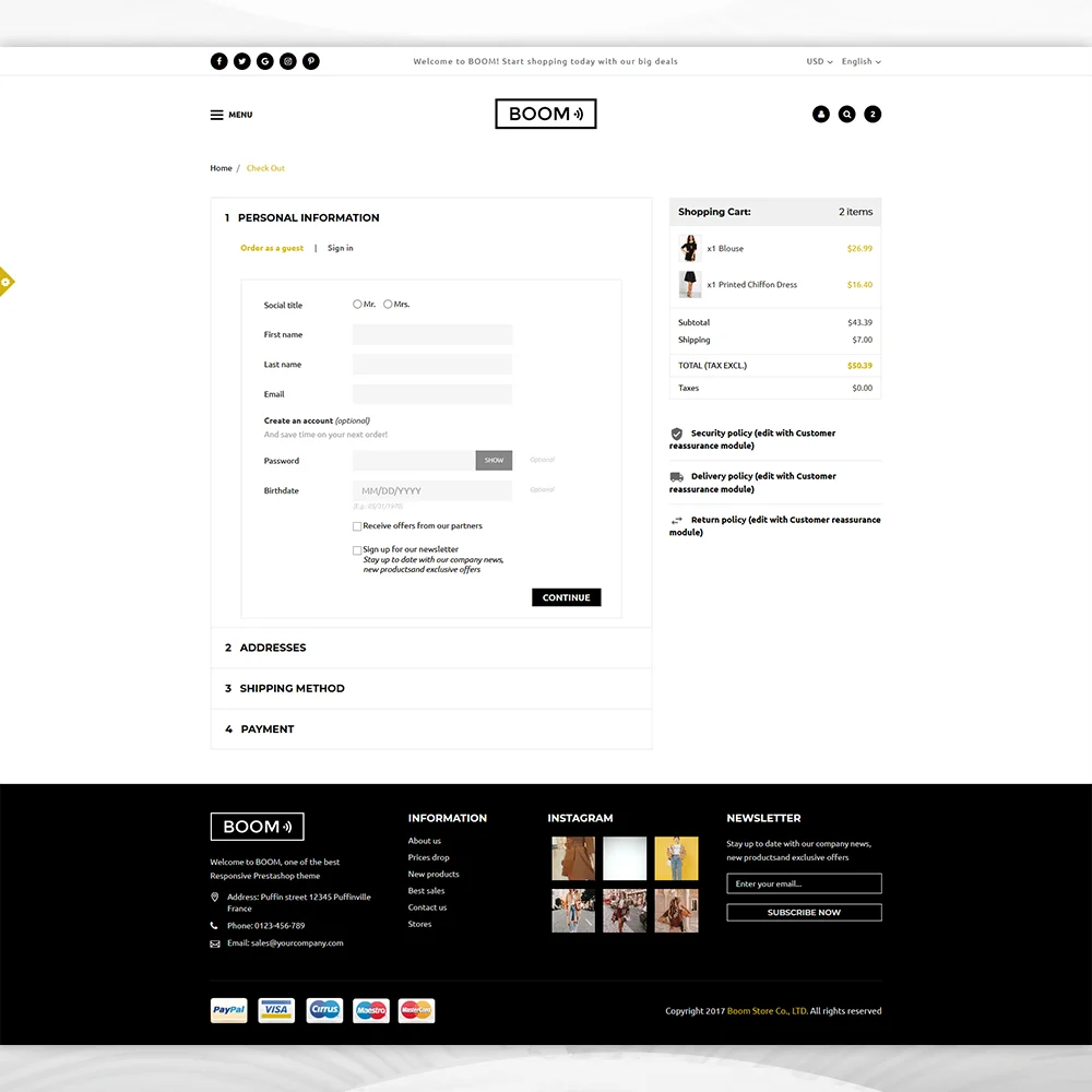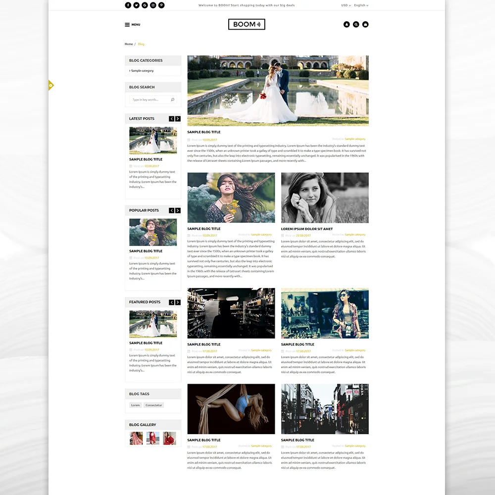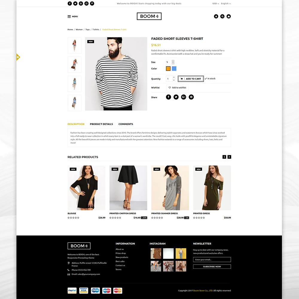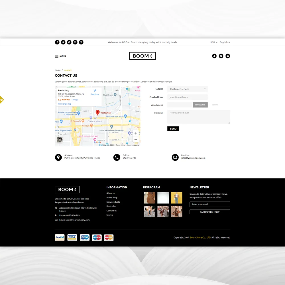 Boom è perfettamente adatto per i negozi di moda e accessori, è completamente reattivo e facile da installare oltre che da personalizzare con un potente pannello di editor del tema. Questo tema è stato sviluppato e testato attentamente secondo gli standard dei siti web popolari oggi (convalida w3c, tutti i moduli PrestaShop personalizzati sono convalidati, compatibilità con i browser, implementazione HTML/CSS3...)