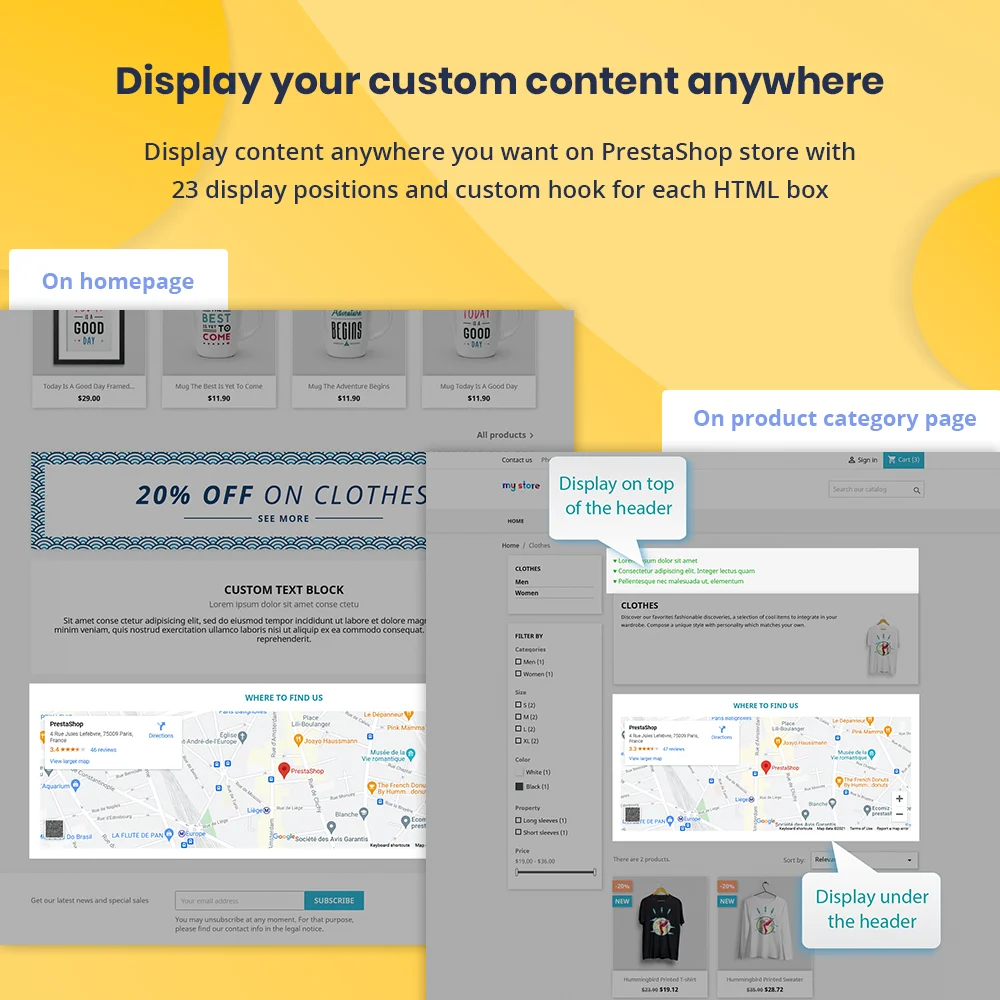 Grazie al nostro modulo PrestaShop HTML – “HTML Box”, puoi facilmente creare, visualizzare ed evidenziare contenuti in qualsiasi posizione desideri per rendere il tuo sito web più attraente e eccezionale, quindi aiutarti a raggiungere i tuoi obiettivi di vendita.