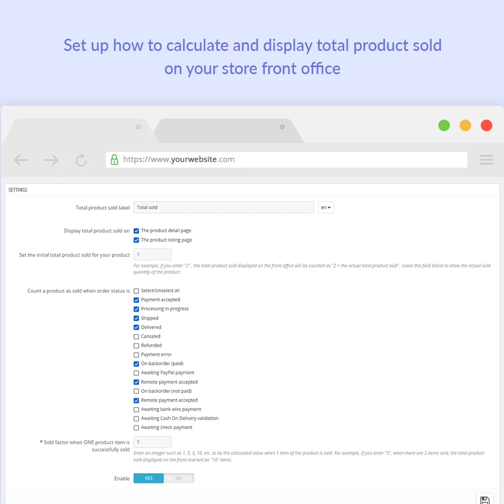 Total Product Sold è un modulo gratuito per il conteggio delle vendite di PrestaShop che ti aiuta a contare e visualizzare il numero di articoli venduti in totale per ciascun prodotto nella pagina dei dettagli del prodotto e nella pagina di elenco dei prodotti.
