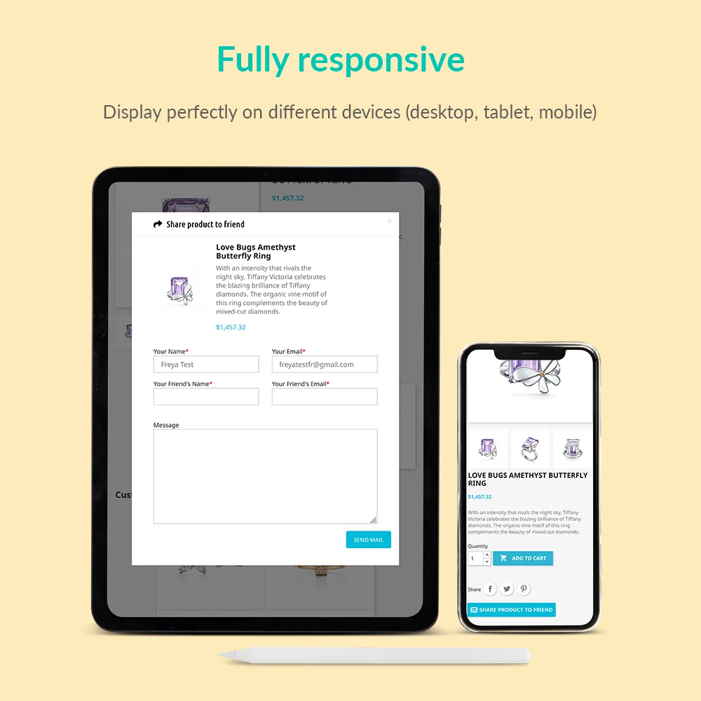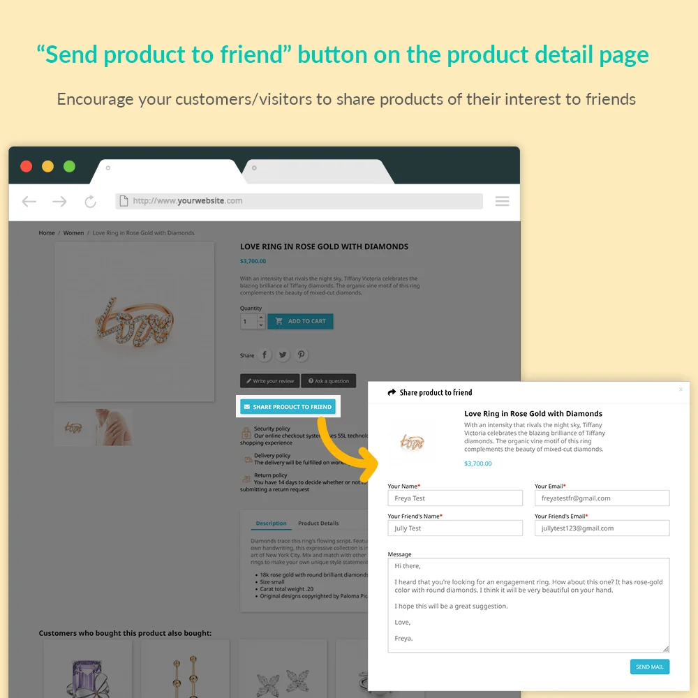 "Send product to friend" è un modulo gratuito PrestaShop di invio a un amico che crea un pulsante personalizzabile nella pagina dei dettagli del prodotto per aiutare i tuoi clienti a condividere comodamente un prodotto con i loro amici via e-mail insieme a un messaggio personale.