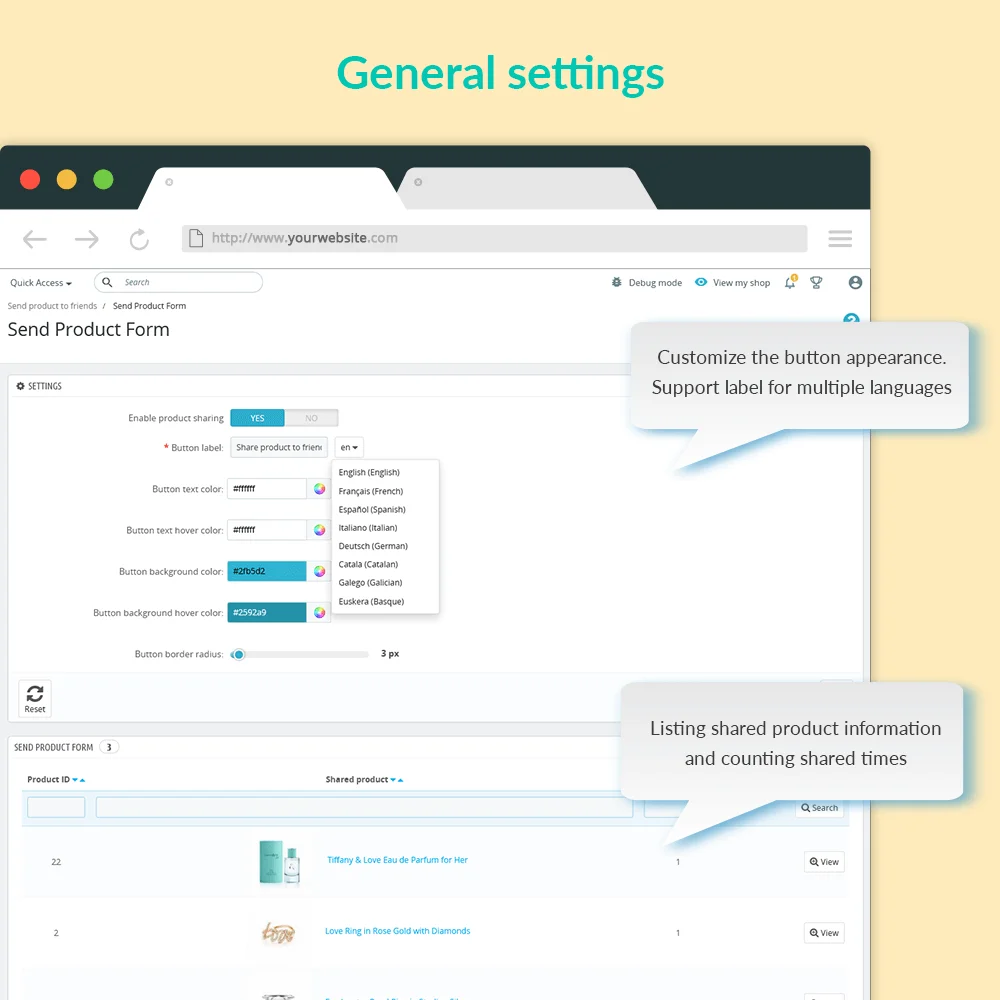 Puoi facilmente abilitare un pulsante “Send product to friend” sulla pagina dettaglio del prodotto e inviare rapidamente un prodotto a un amico, inclusa una messaggio privato via email. Il colore del pulsante e il bordo possono essere personalizzati per integrarsi bene con qualsiasi tema PrestaShop.