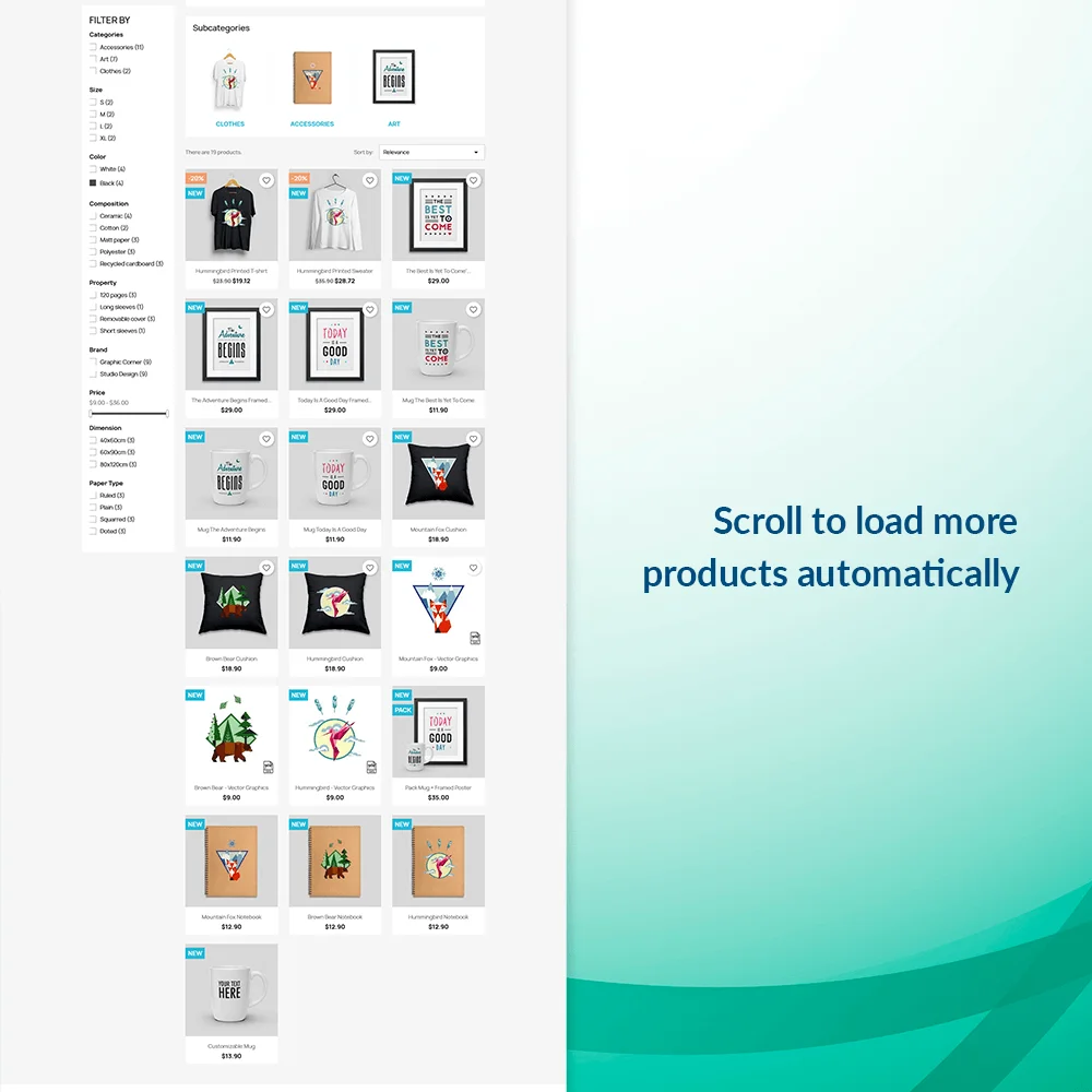 +1 MoreModulo di impaginazione dell'elenco dei prodotti PrestaShop - Aggiungi l'impaginazione alla pagina dell'elenco dei prodotti sul negozio PrestaShop in 3 modi: impaginazione, pulsante "Carica altro" o scorri per caricare più prodotti automaticamente .