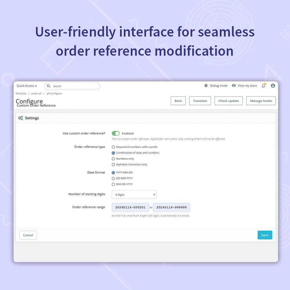 Eleva l'efficienza di elaborazione degli ordini PrestaShop con il nostro potente modulo Custom Order Reference gratuito. Questo strumento potente permette ai proprietari di negozi di ridefinire i numeri d'ordine secondo le proprie preferenze. Che tu preferisca numeri sequenziali con un prefisso, una combinazione di data e numeri, solo numeri o solo caratteri alfabetici, il nostro modulo fa al caso tuo.