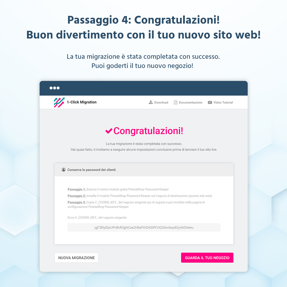 Se hai già un sito web PrestaShop in esecuzione su una vecchia versione di PrestaShop (1.7, 1.6, 1.5), questo modulo fa al caso tuo!! "1 CLICK to Migrate or Upgrade" - uno dei migliori moduli di migrazione per PrestaShop ti aiuterà a migrare rapidamente il tuo sito web e a gestire tutto il trasferimento dei dati verso PrestaShop 9 o PrestaShop 8.x (ultima versione), senza alcuna conoscenza di programmazione o comprensione avanzata del software e-commerce PrestaShop.