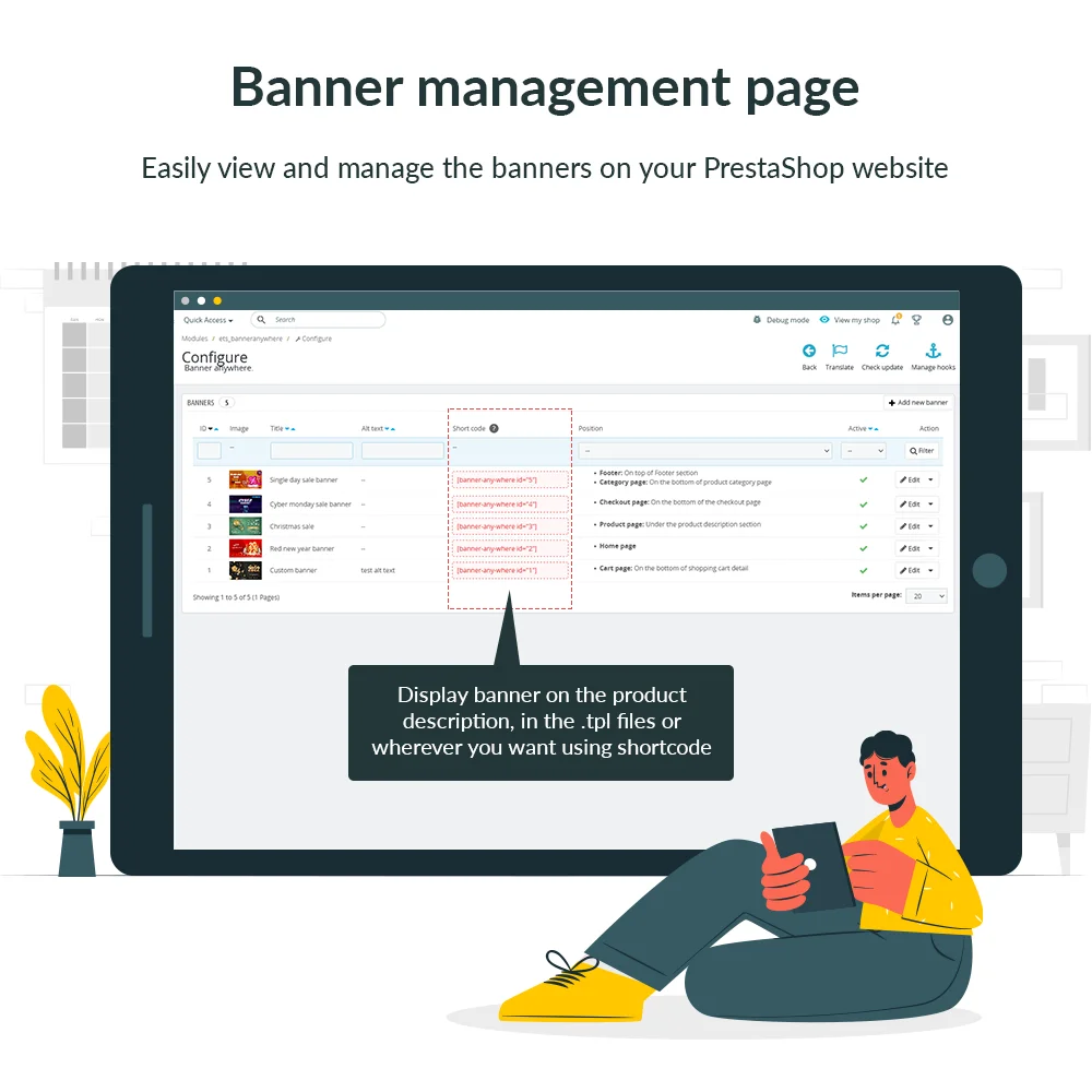 +2 MoreDễ dàng thêm banner trên trang chủ, trang danh mục, trang sản phẩm, trang thanh toán, hoặc bất kỳ đâu bạn muốn với mô-đun biểu ngữ miễn phí của chúng tôi cho PrestaShop - Banner Anywhere.