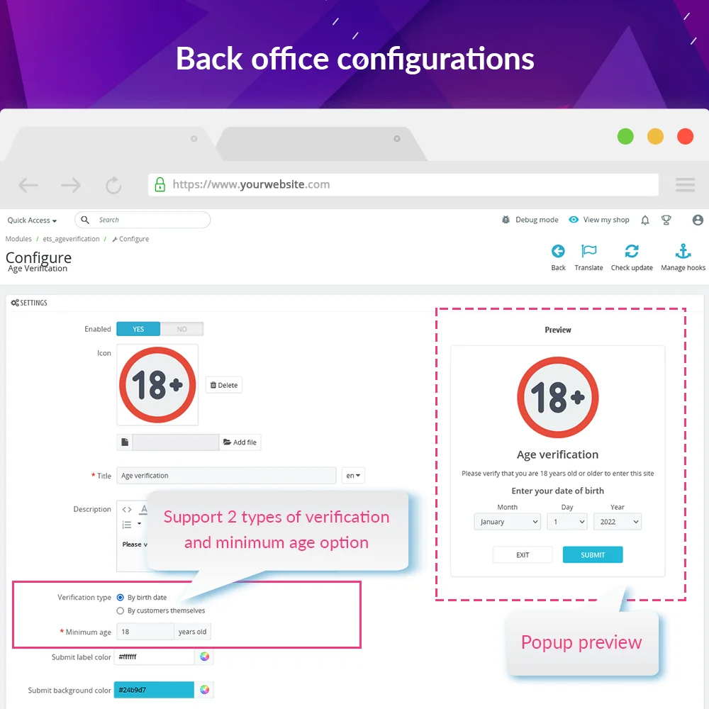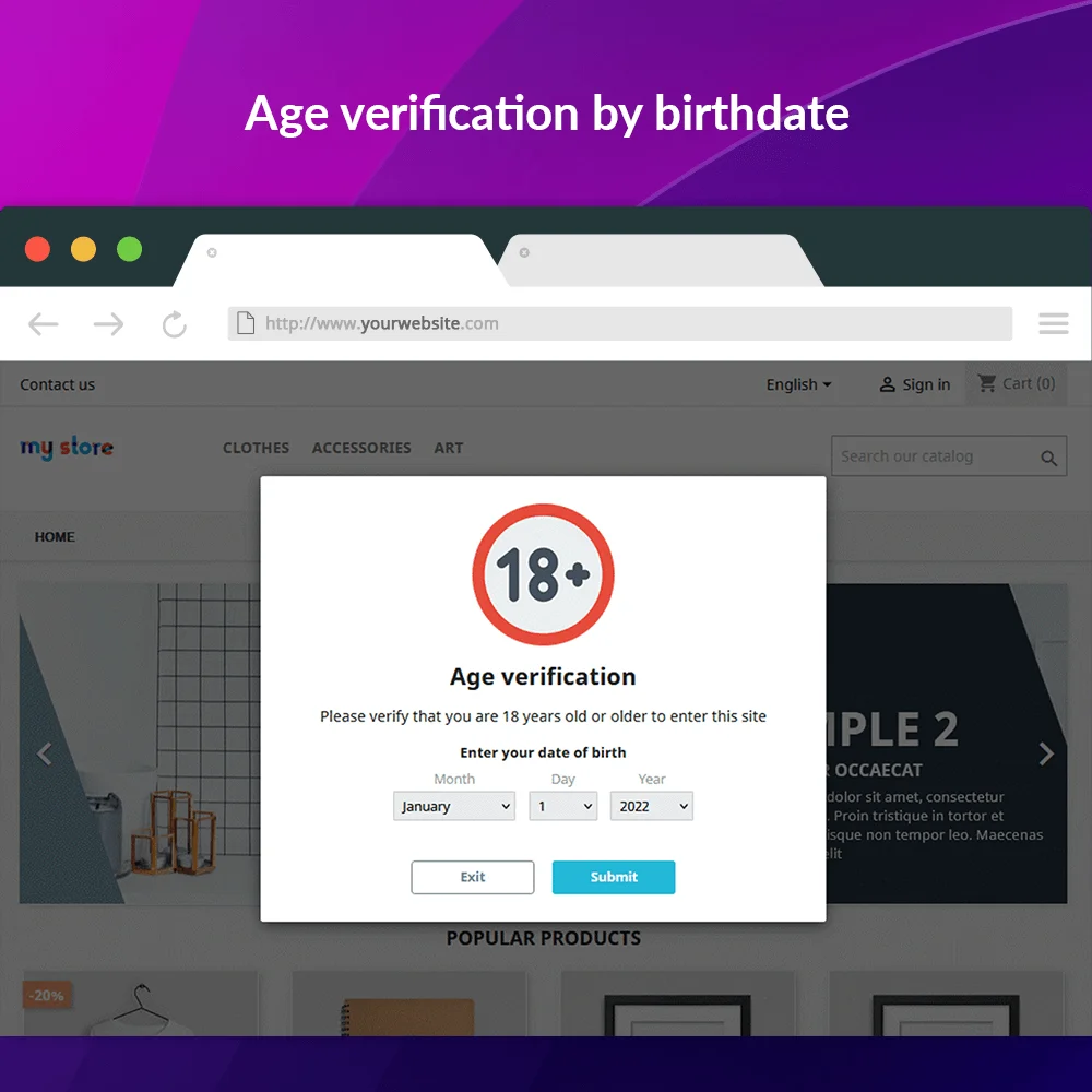 Xác minh tuổi - module xác minh tuổi PrestaShop của chúng tôi có thể giúp bạn tích hợp tiện ích này vào trang web cửa hàng của bạn. Giúp bạn kiểm tra tuổi của khách truy cập của bạn. Và đừng lo lắng, nó hoàn toàn MIỄN PHÍ!